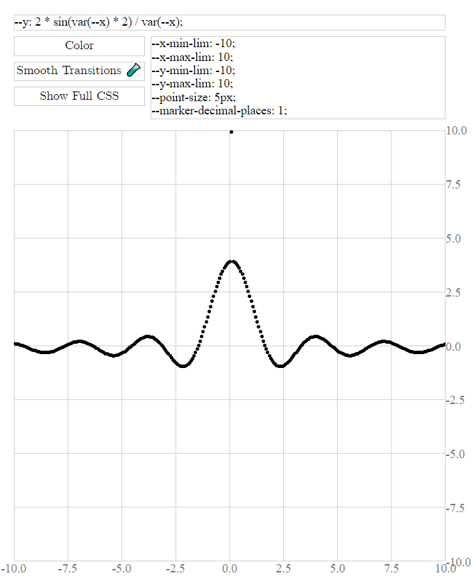 The function input box is just a <style> block that modifies .graph .pt elements (among others to be discussed later). Just like any other element, these blocks can be made visible by using display: inline-block. Additionally, to make the text of the style block editable, we add the contenteditable attribute to the HTML. Any styling you enter will be used throughout the page.
